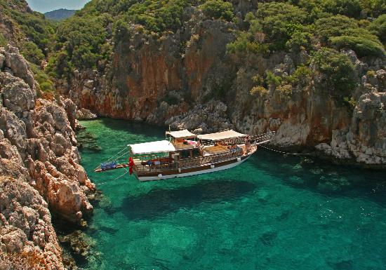 Die nur über das Meer zu erreichende Blaue Höhle (Mavi Mağara) ein paar Kilometer östlich des Kaputaş-Strandes zwischen Kaş und Kalkan ist einer der Orte, die ein wunderschönes Schauspiel bieten und von Gästen der Region auf jeden Fall aufgesucht werden.